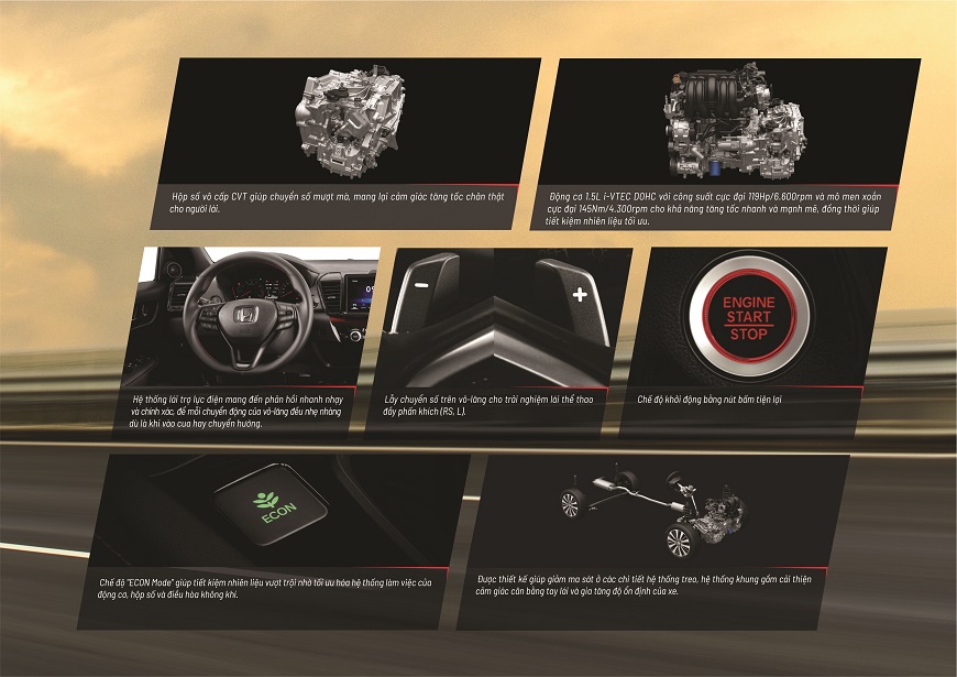 >Động cơ 1.5L i-VTEC DOHC với công suất cực đại 119Hp/6.600rpm và mô men xoắn cực đại 145Nm/4.300rpm cho khả năng tăng tốc nhanh và mạnh mẽ, đồng thời giúp tiết kiệm nhiên liệu tối ưu.